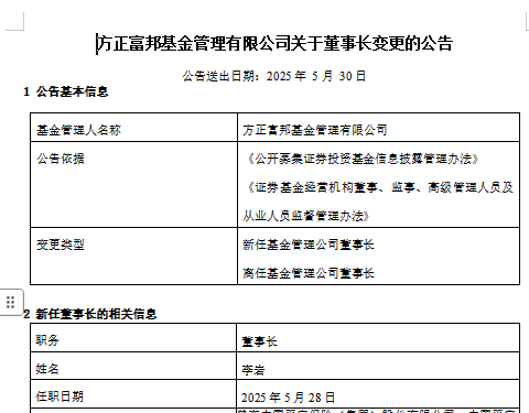 5月29日晚,方正富邦基金发布关于董事长变更的公告,任命李岩为公司新一任董事长,何亚刚因到龄退休离任,离任日期为5月28日。